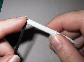 Es gibt in bestimmten Ländern, eigens für Quilling, lange Streifen die 3mm breit sind. Mit den Papuelastreifen geht es aber auch sehr gut. Um eine Form zu formen, steckt man ein Ende eines einzelnen Streifens in die Nadel und dreht ihn dann auf. Wer keine Nadel hat, kann es auch mit einem Zahnstocher oder einer Pinzette machen.