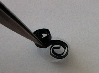 | Zum Kleben mache ich einen großen Kleberklecks auf ein Schmierblatt. In diesen Klecks tunke ich vorsichtig mit einer Pinzette die Quillingform rein. Dann wird die Form auf die Karte geklebt. Aber Vorsicht!!! Achtet auf Fäden, die bilden sich gern bei dieser Technik und dem Kleber. :o) |